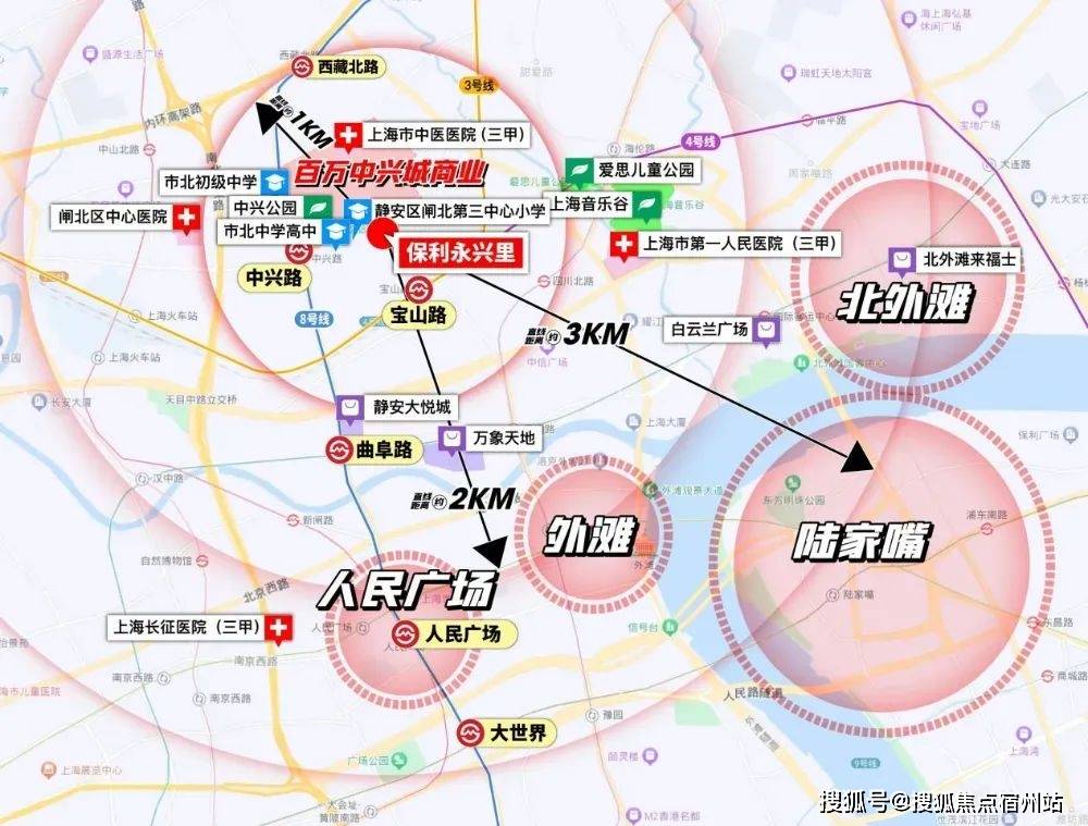 ▲ 区位图①几何中心从保利·永兴里出发,到人民广场(2.3公里)、到苏河湾商圈(900米)、到外滩、陆家嘴(3公里),