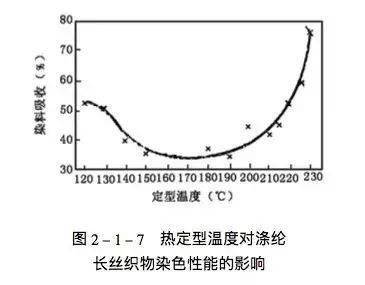 但定型温度超过180℃以后,虽然纤维密度仍进一步增大,但上染百分率和上染速率却又有所提高。产生这一矛盾现象的原因,至今还存在着不同的看法。一种认为在定型过程中当温度低于190℃时,主要是形成一些尺寸比较小的结晶,超过190℃,该条件适宜于结晶尺寸突然增大,因此在晶区之间形成较多的裂缝,从而有利于染料分子的扩散;外一种则认为可能是由于分子运动进一步加剧,发生解取向作用所致,但有些实验发现,只有当定型温度达到220℃时,大分子的解取向作用才变得明显。