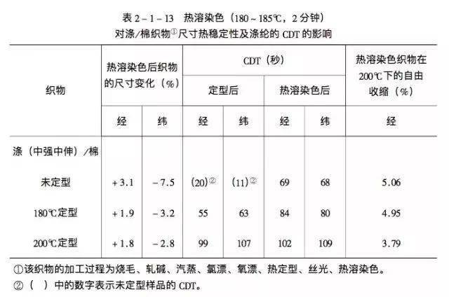 从表2-1-13可以看出,经过热定型的织物,在热溶染色过程中的尺寸稳定性比未定型的有显著的提高,并随定型温度的提高,尺寸变化率变小;热溶染色后涤纶的CDT虽然仍随它们的“受热史” 不同而有一定的差异,但相互间(未定型、180℃和200℃定型)的差距显著变小,主要是热溶染色温度高于热定型温度或与之相近时,对纤维的CDT有一定的提高作用,若低于热定型温度时作用不明显。